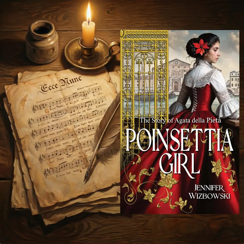 Through Agata’s eyes, we experience the daily rhythms of life in the Pietà. Agata arrives as a shy heroine who refuses to sing, believing her voice is unworthy. Over time, she learns new choral pieces and instruments. It is only when she discovers a special song that she finds her true strength and ultimately becomes a Poinsettia Girl—one of the select few who perform in public concerts for nobility and dignitaries. The song is written by none other than… The story was also a learning experience for me—even in this isolated, almost “out-of-this-world” historical setting of the nun-run orphanage, Wizbowski captures the very real and very human, almost cut-throat ambition and competition. It is an interesting commentary on human nature.